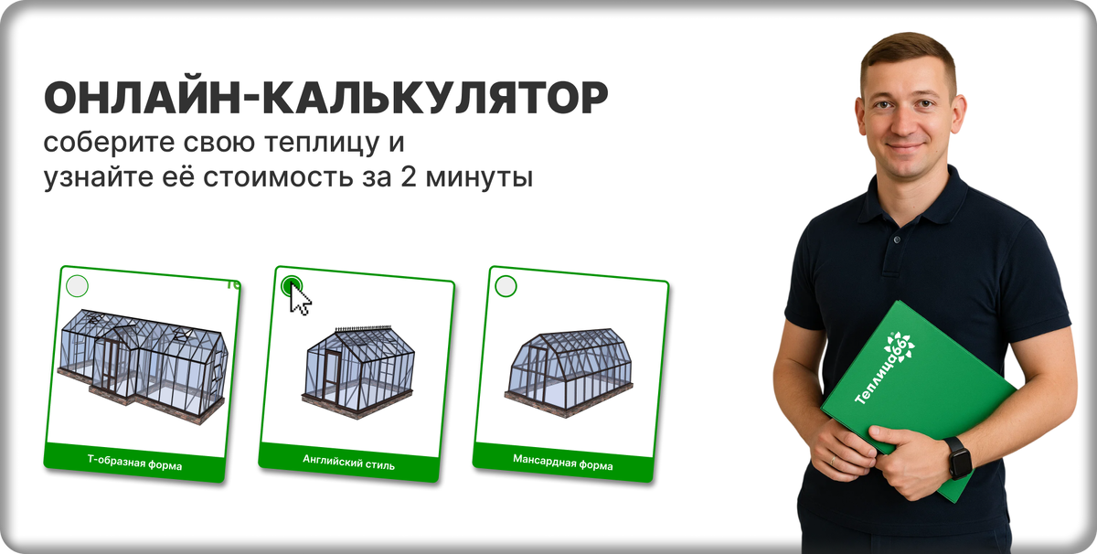 Если вы сомневаетесь, какой вариант выбрать - воспользуйтесь онлайн-калькулятором и подберите теплицу под себя сразу со стоимостью!